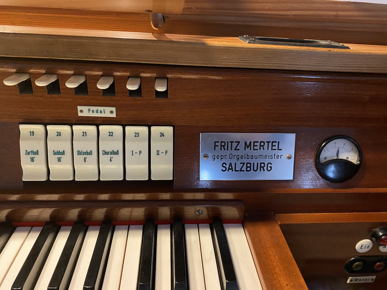 Die Orgel ist – ähnlich der ehem. Mertelorgel in Salzburg-Gnigl – auf Stahlträgern an der Kirchenrückwand aufgehängt. Die Zugänglichkeit zu den Pfeifen ist extrem beengt. Aufgrund mangelnder Raumhöhe wurden diverse 8' lange Pfeifen, u.a. Prinzipal 8', etwa 1 Meter tiefer an der Rückwand aufgestellt und dafür ein kurios anmutender Unterbau mit Pfaffengittern erstellt. Das Gebläse liegt in einem weiteren, provisorisch anmutenden Anbau auf Fußbodenniveau der Empore. Einige Pfeifen entstammen der Vorgängerorgel (u.a. Gedeckt und Flöte im 2. Manual, sowie div. Metallpfeifen – alle von Mooser, aber auch die alten Zink-Prospektpfeifen aus den 1920er-Jahren wurden als Oktave 4' im HW weiterverwendet).