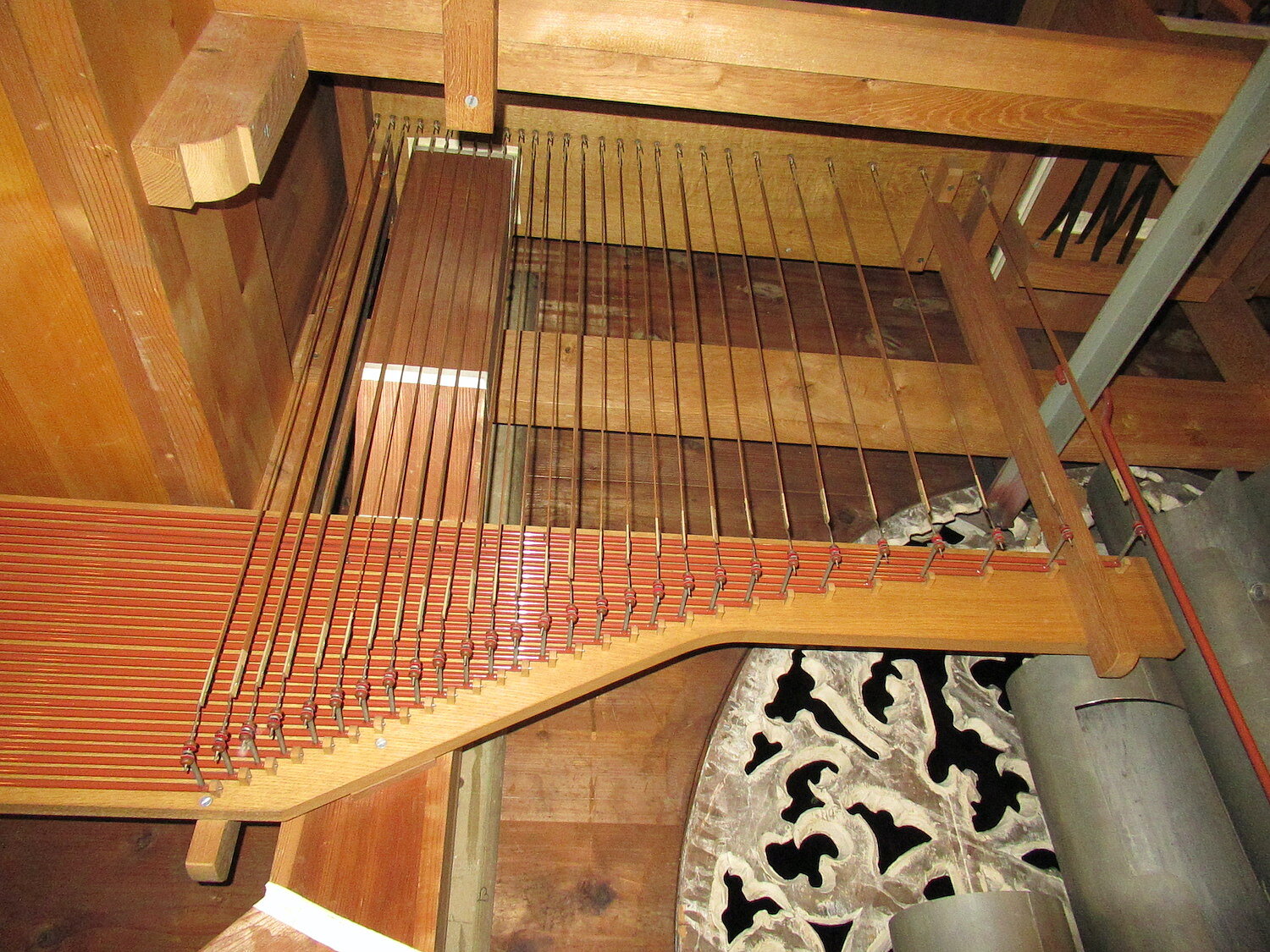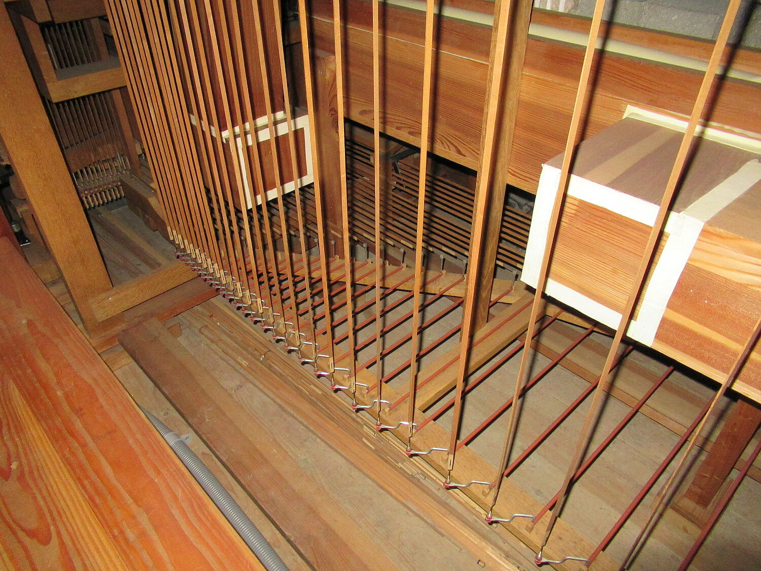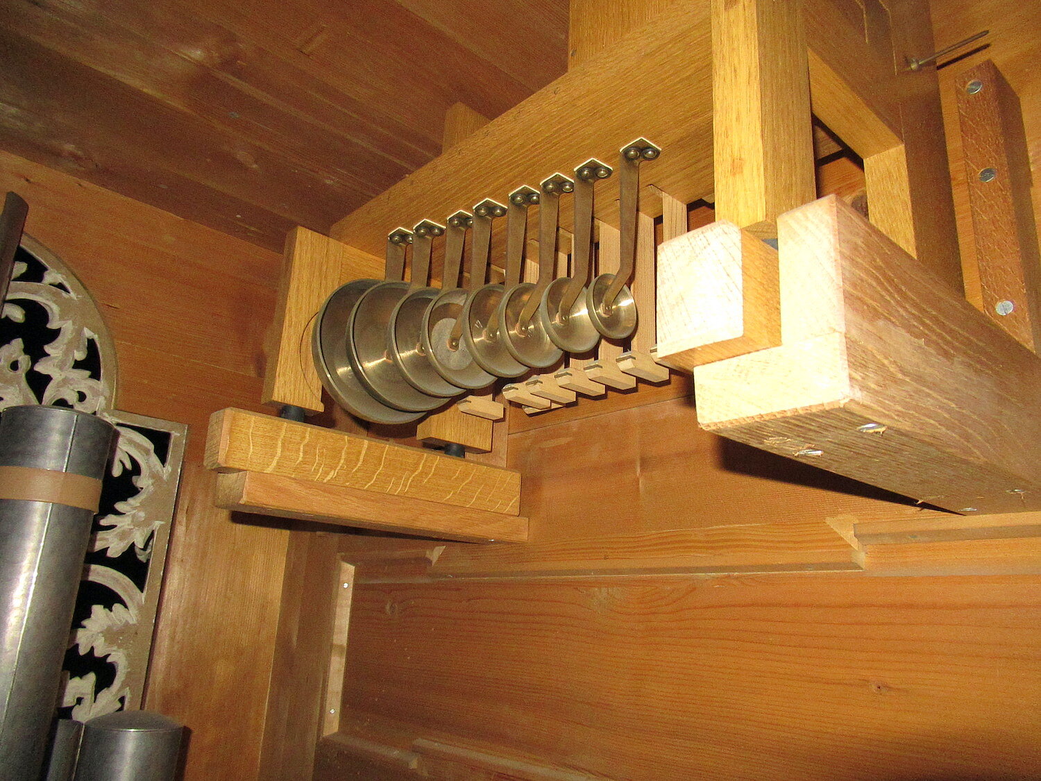 | Spielhilfen | I/II, III/II (als Züge) I/P, II/P, III/P (als Hakentritte) Hw 16' Plenum an/ab, Zungen 16-8-4 Pedal & Trompete 8 HW an/ab (als Federtritte) |