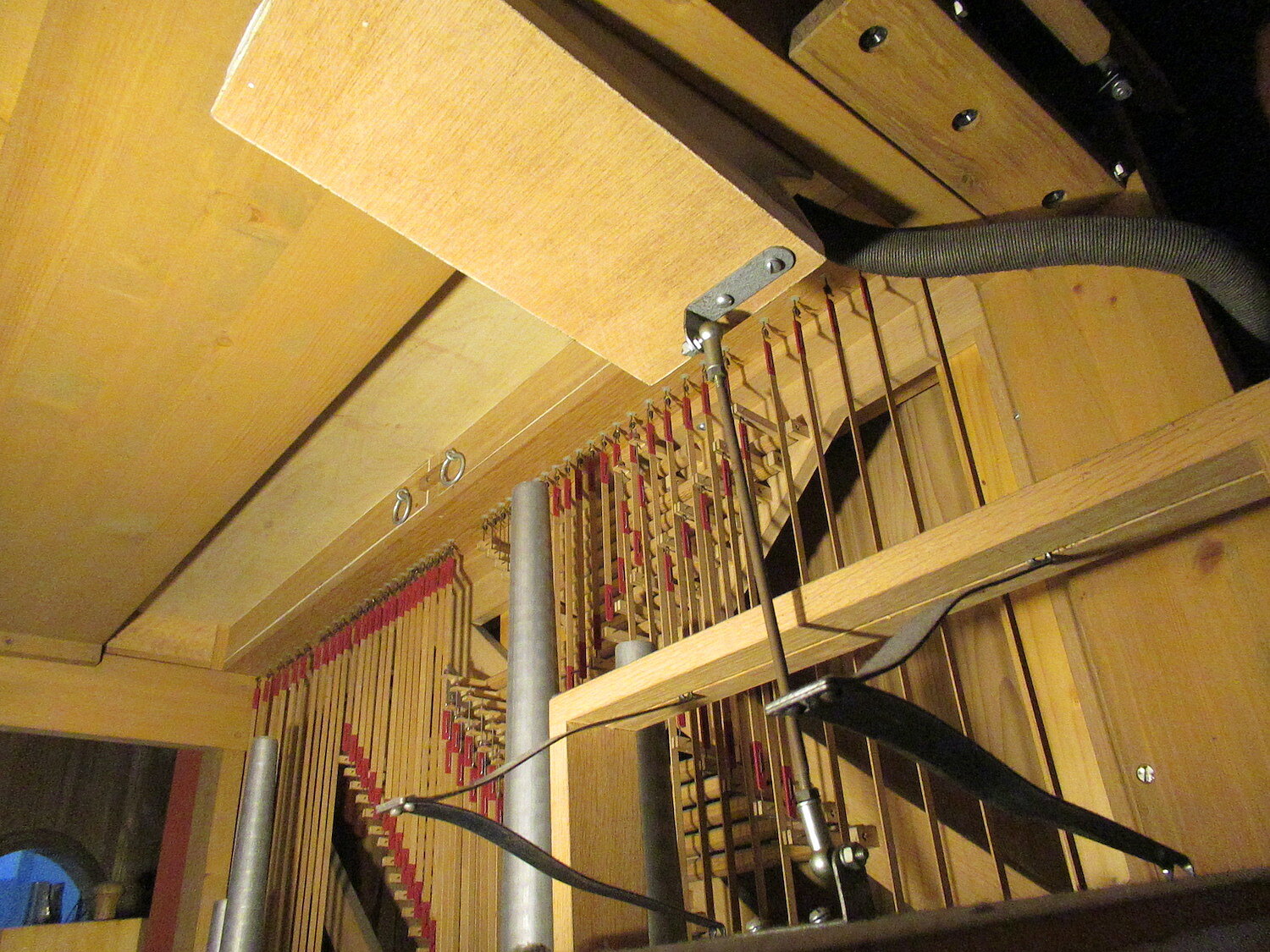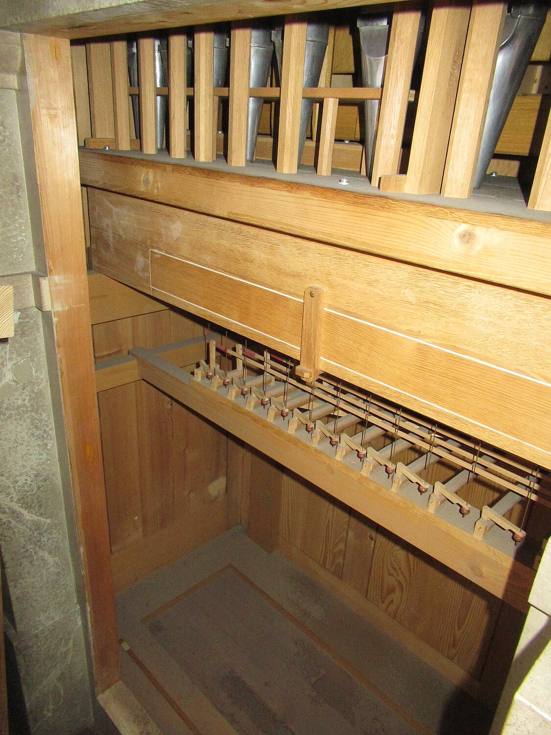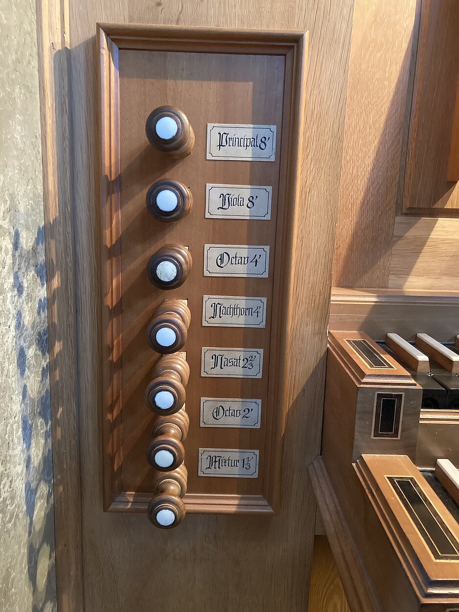 | Spielhilfen | II/I, I/P, II/P als Fußrasten, Tremulant als Registerzug. |