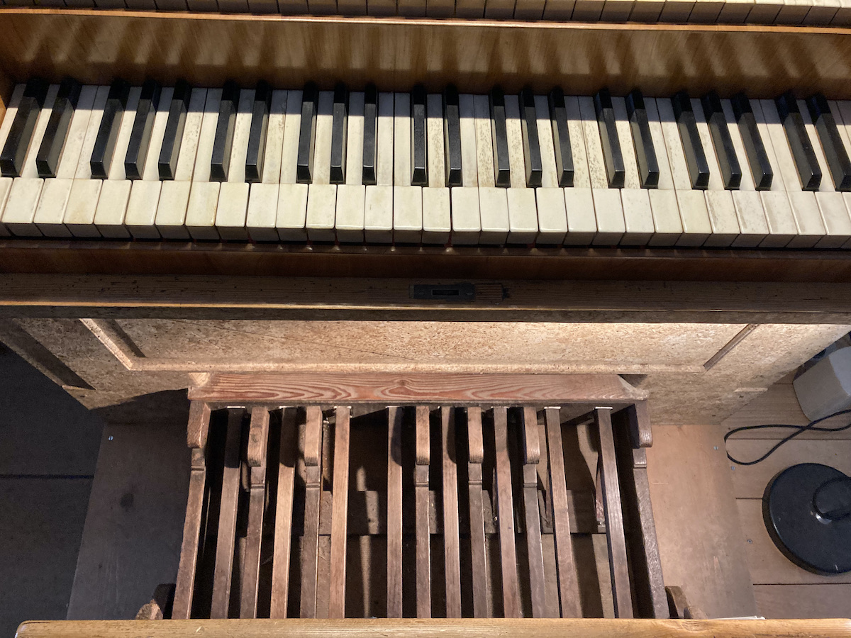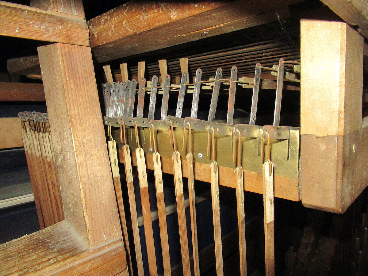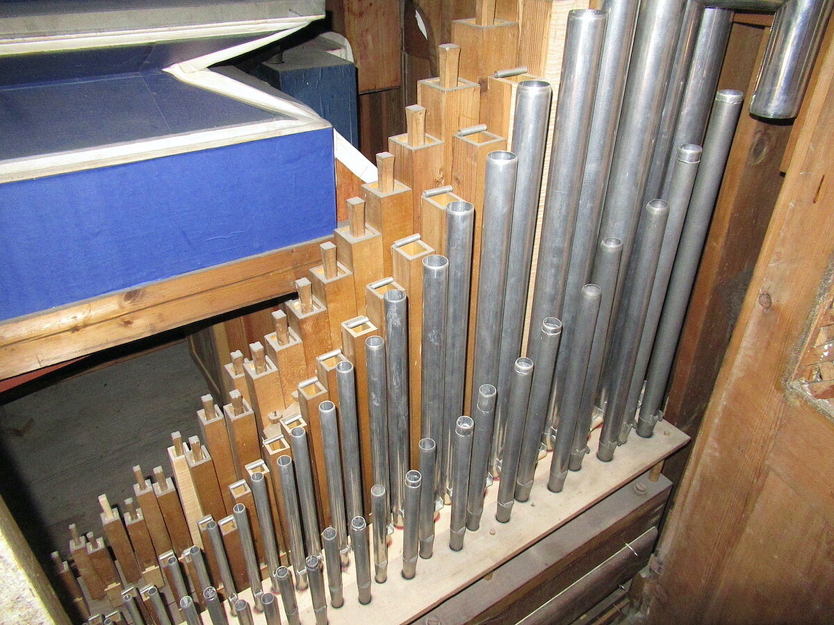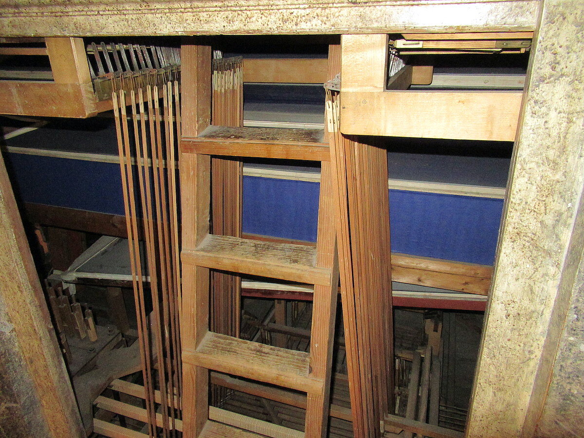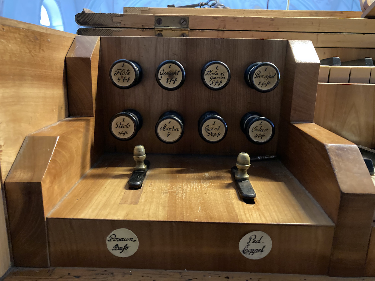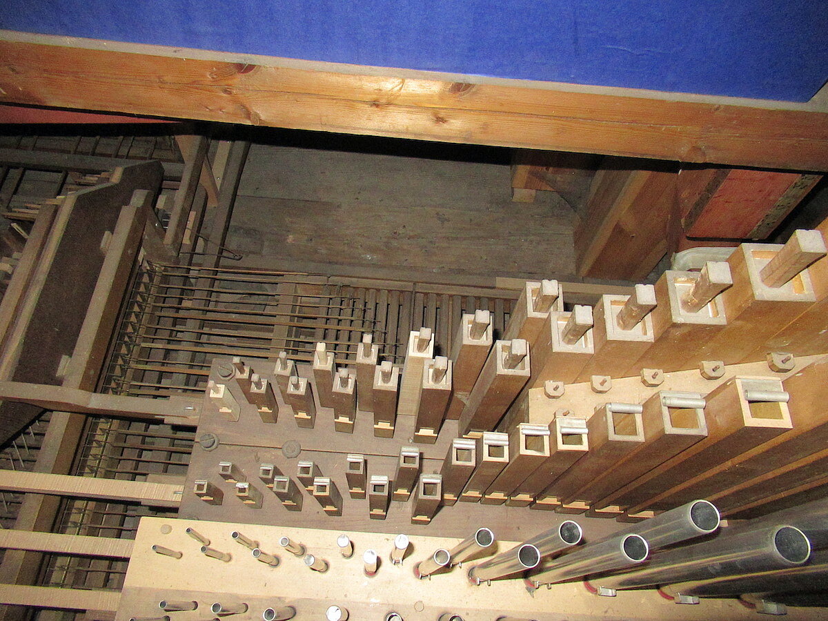 | Spielhilfen | Manualkoppel, Pedalkoppel Hauptwerk (beide als Metallschieber neben den Klaviaturen) |
