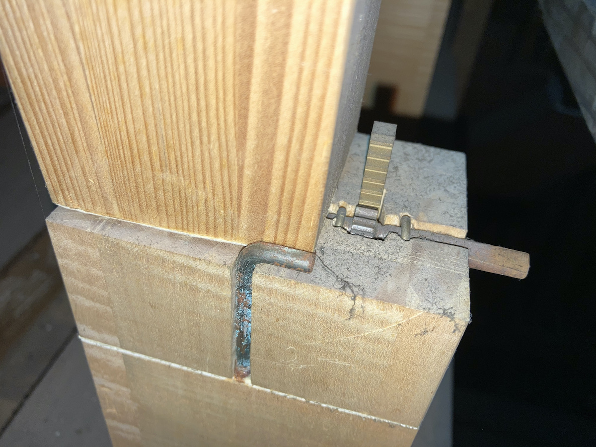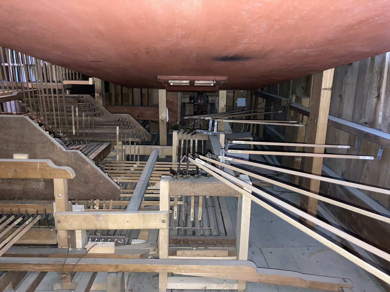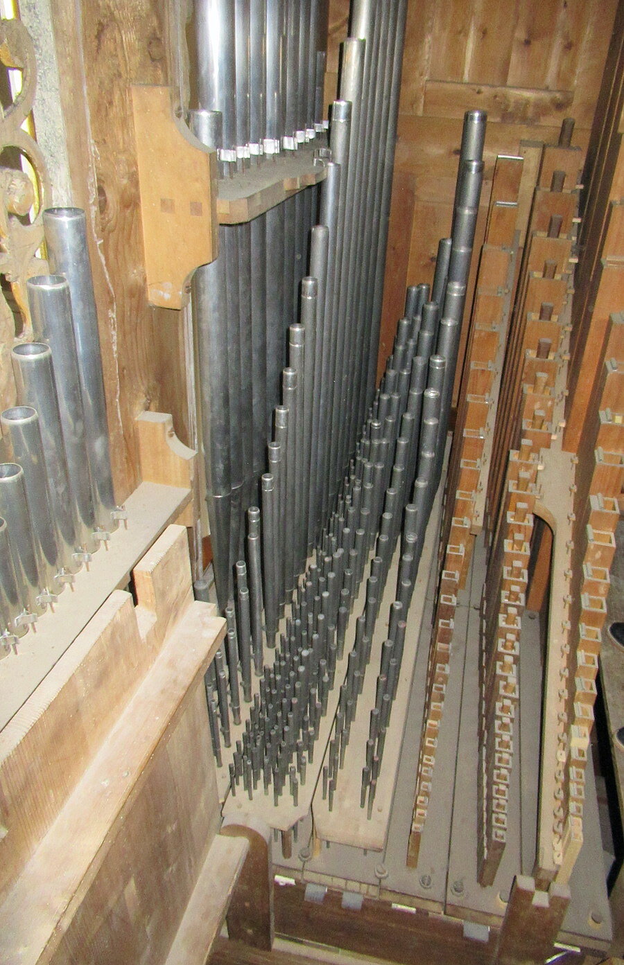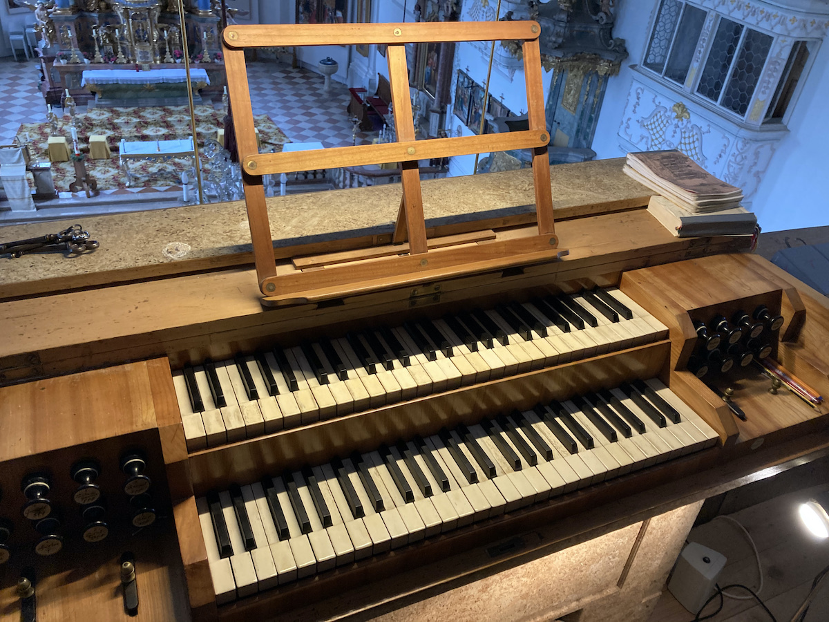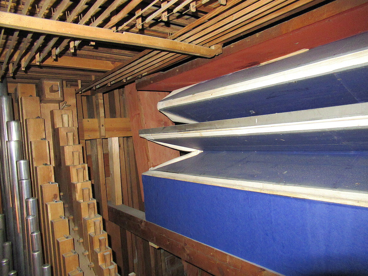 | Spielhilfen | Manualkoppel, Pedalkoppel Hauptwerk (beide als Metallschieber neben den Klaviaturen) |