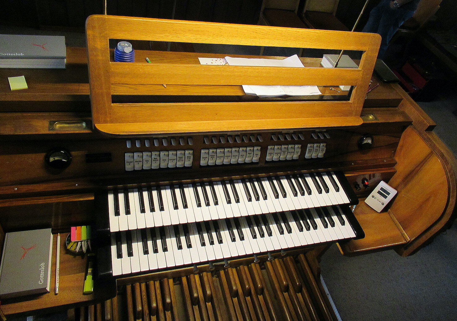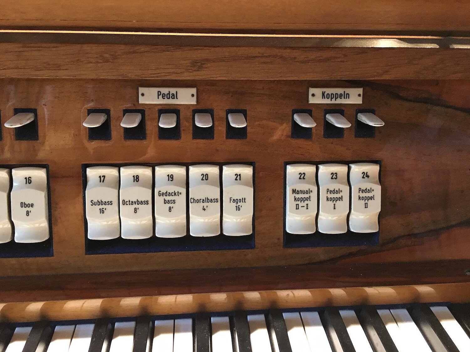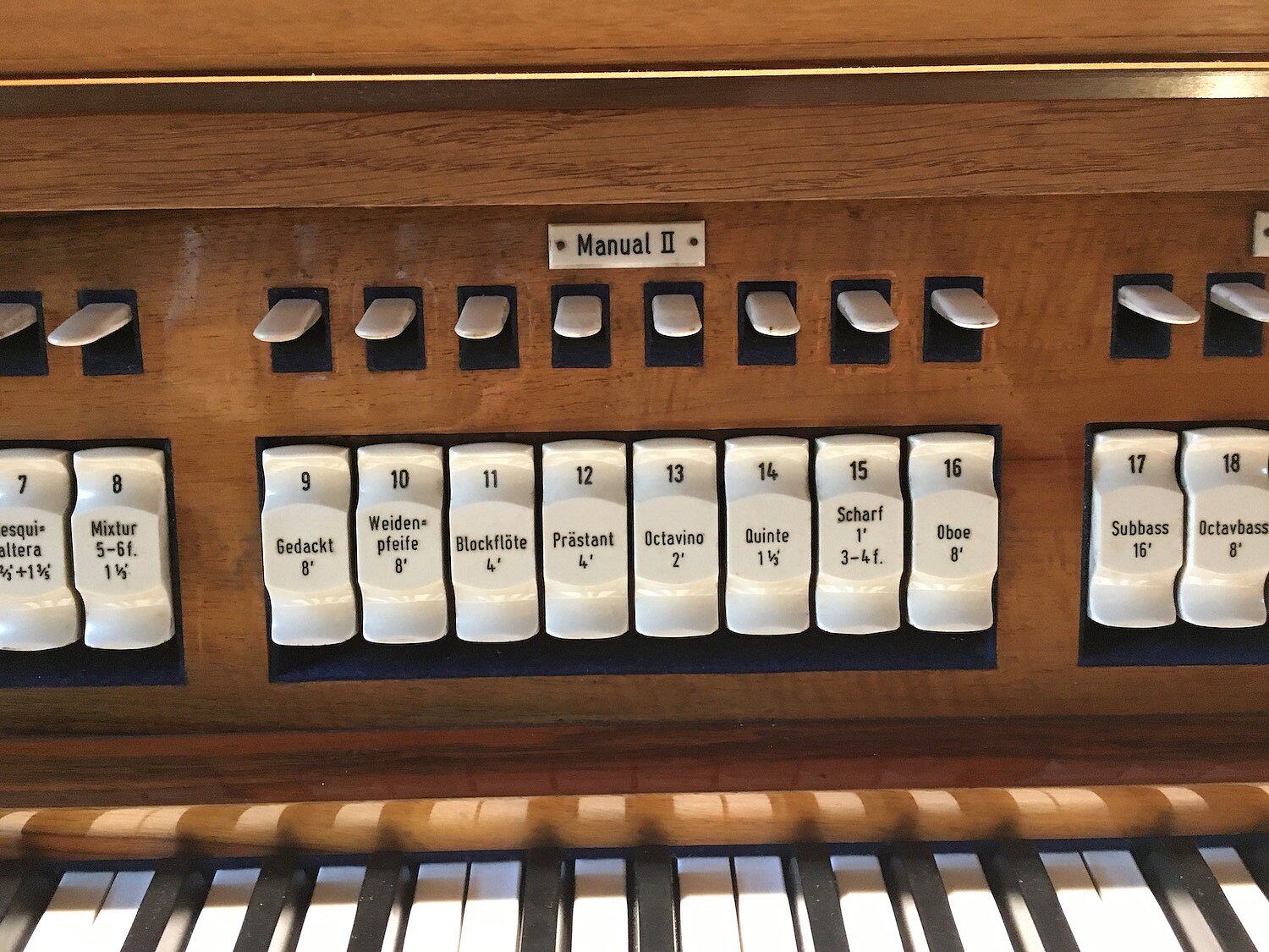 | Spielhilfen | II/I, I/P, II/P, Tutti, Freie Kombination, Crescendotritt, Zungen ab, Cresc. ab, Auto. Ped. ab. |