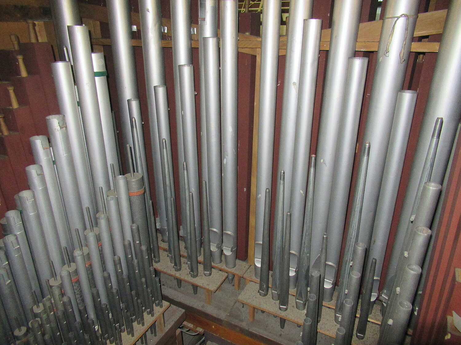 | Spielhilfen | II/I, I/P, II/P (über Tritte), Registertraktur sonst über Wippen. |