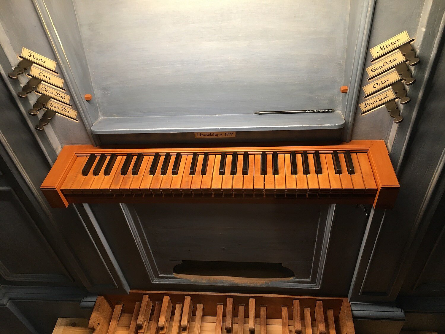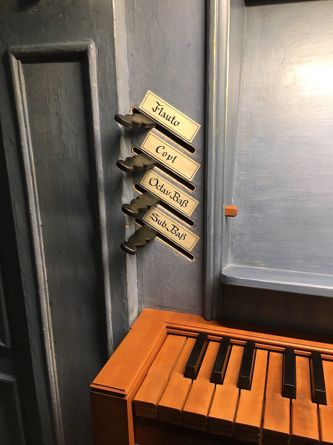| Spielhilfen | Pedalkoppel (als Hebel rechts unterhalb der Manualklaviatur) |