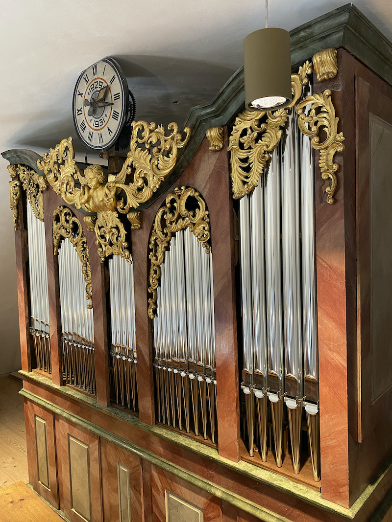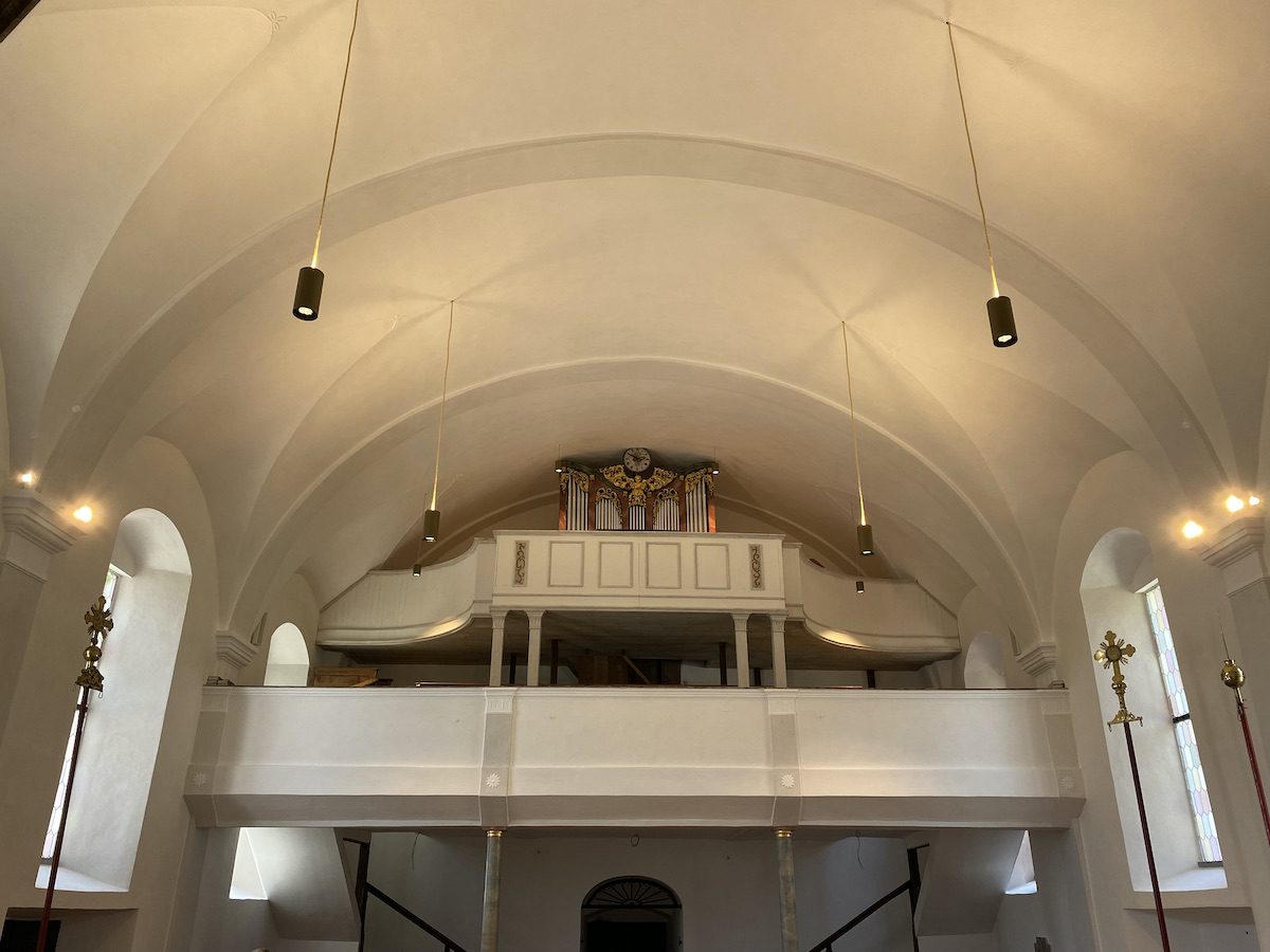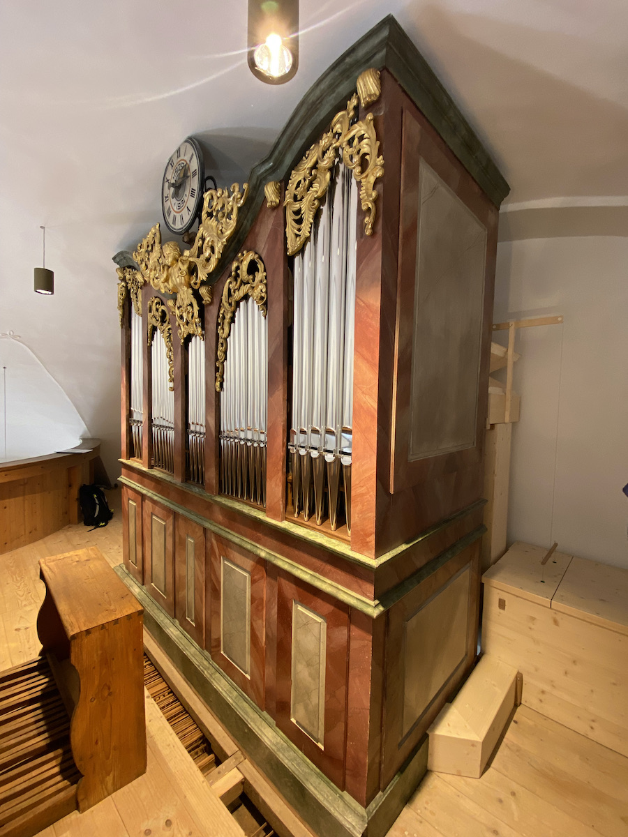 Restaurierung des Orgelwerks mit Rekonstruktion des Mooser'schen Faltenbalgs 2023-2024 durch Roland Hitsch, Salzburg.