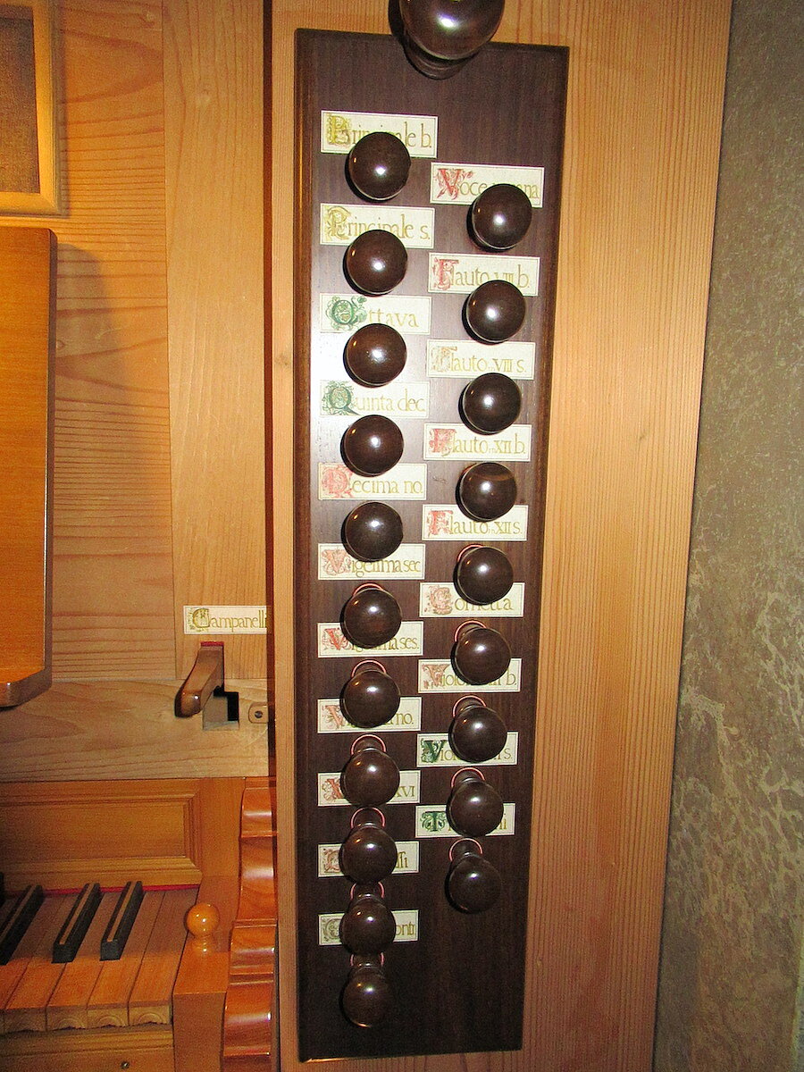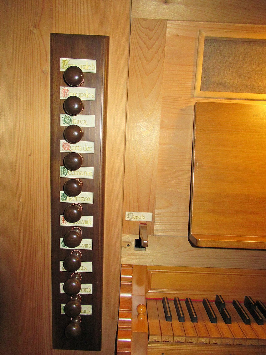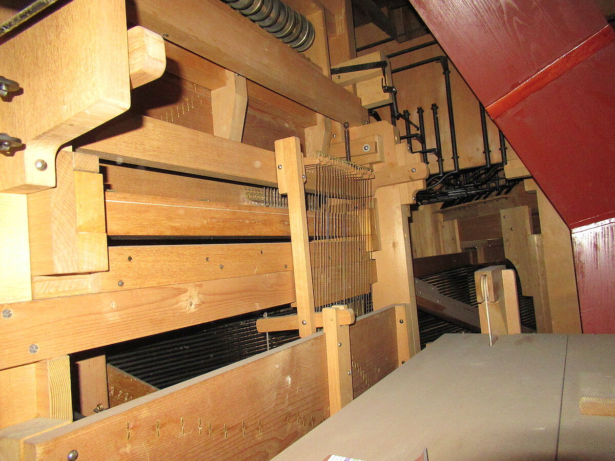 | Spielhilfen | Tritt Ausschaltung Pedalkoppel II Tritt Tamburo (nur aktiv wenn Contrabassi eingeschaltet) Ripieno GO (Kurbel, ohne Principale 8') |